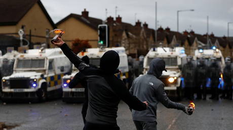 At one point, a police line was targeted with a car, which was set on fire and pushed towards the officers by demonstrators. A similar carjacking and torching tactic was used during a tense Wednesday night, when a bus was destroyed by protesters in west Belfast.